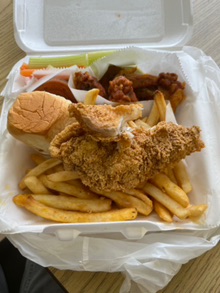 These are awesome wings. We came from out of town and didn't know that the wings came whole meaning you get both the drum and flat. We got wing/fried rice combo and a wing/catfish combo both honey hot